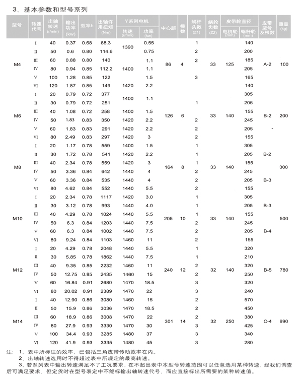 1.3選擇減速機型號時,要根據輸出軸轉速與輸出功率這兩個參數在表3-1中選擇型號。